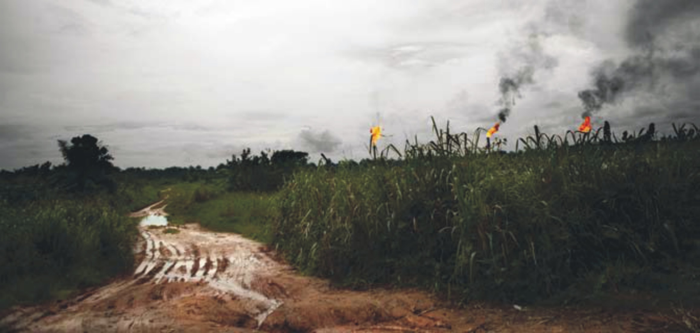 “Le torce del gas flaring sono ovunque nella regione del delta del Niger, ma poche sono drammatiche come l’Oshie flare, di proprietà della compagnia petrolifera italiana Agip”. (C.Hondros, The price of oil)