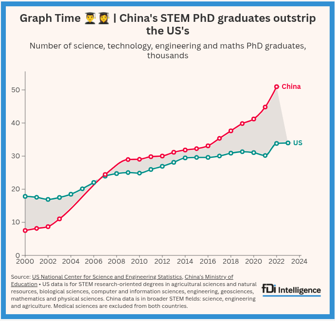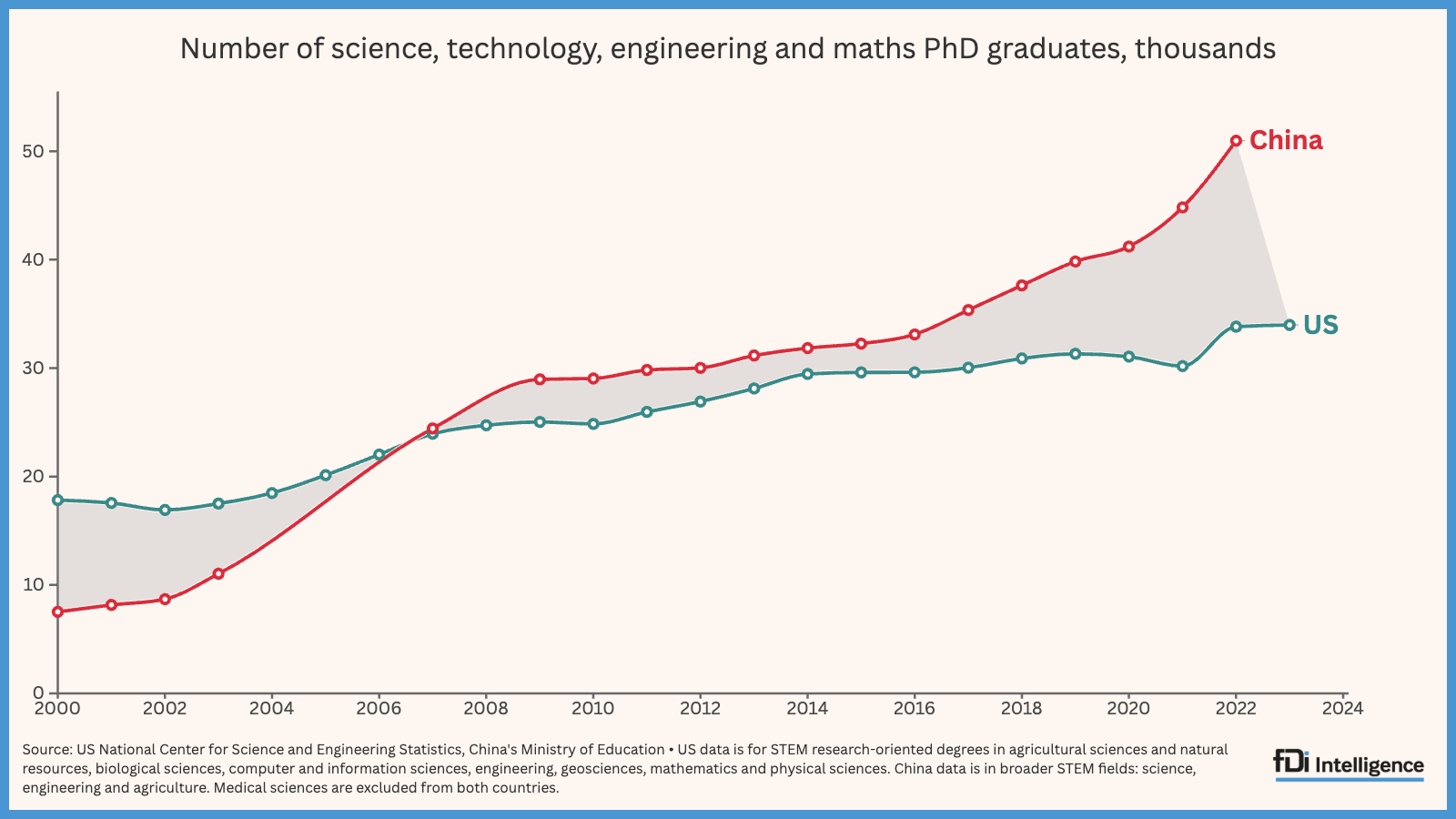 Tuttavia, i dati mostrano anche una tendenza divergente che allarga il divario tra i due Paesi. La Cina ha superato gli USA per numero di dottorati Stem già nel 2007 e ha raddoppiato i numeri entro il 2022. Nello stesso periodo, i dottorati Stem statunitensi sono cresciuti solo del 41%.