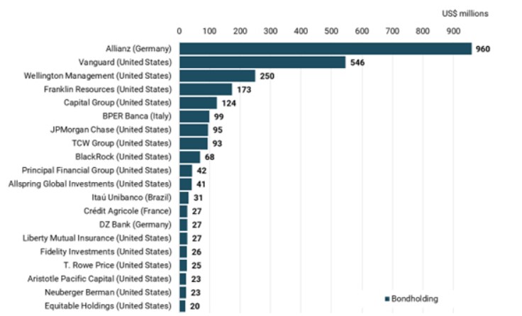 I risultati indicano che i 20 maggiori investitori istituzionali – in gran parte gestori patrimoniali statunitensi e divisioni di gestione patrimoniale di banche e compagnie assicurative statunitensi – hanno fornito finanziamenti a Israele per oltre 2,7 miliardi di dollari attraverso l’acquisto di obbligazioni dall’inizio della guerra.(7)