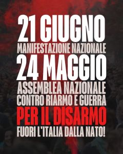Per preparare la manifestazione si convoca una assemblea nazionale il 24 maggio. È fondamentale in questo momento coinvolgere più realtà, organizzazioni, intellettuali e membri della società civile disponibili a costruire un fronte ampio e indipendente contro le politiche belliciste, il riarmo, la Nato e il genocidio in Palestina e per riconvertire gli investimenti in armi in spese sociali.