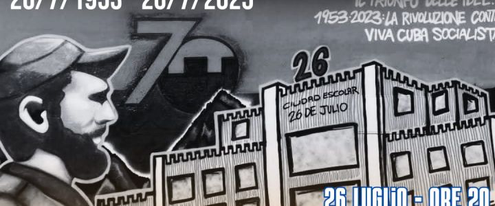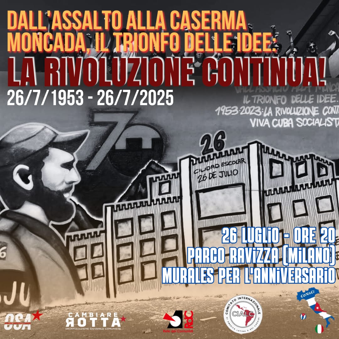 Ci diamo appuntamento quindi sabato 26 luglio alle 20.00 al Parco Ravizza e poi ci sposteremo in via Pompeo Leoni davanti al murales realizzato per i 50 anni dell’assalto alla caserma Moncada in solidarietà e sostegno internazionalista al popolo e al governo cubano.