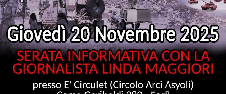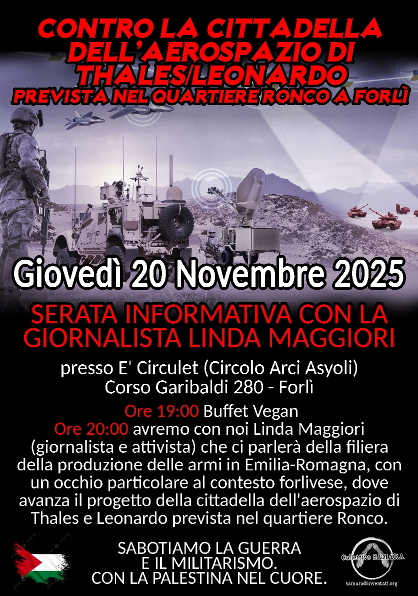 * Ore 20.00 avremo con noi Linda Maggiori (giornalista e attivista) che ci parlerà della filiera della produzione delle armi in Emilia-Romagna, con un occhio particolare al contesto forlivese, dove avanza il progetto della cittadella dell’aerospazio di Thales e Leonardo prevista nel quartiere Ronco.