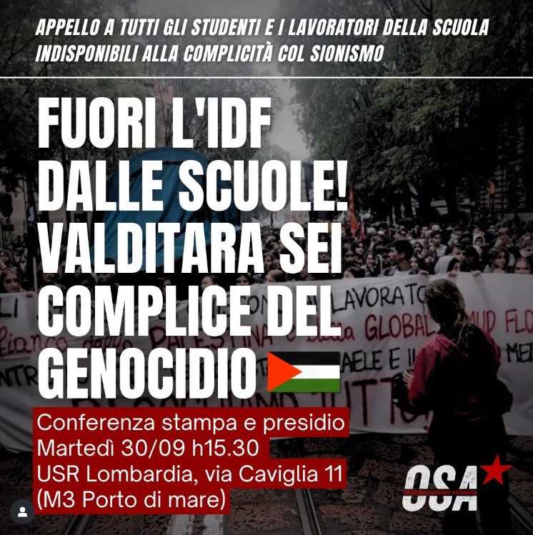 Fuori l’IDF dalle scuole! Non possiamo accettare in alcun modo la presenza di soldati israeliani nelle nostre scuole, martedì saremo in conferenza stampa in via Caviglia 11 davanti all’Ufficio Scolastico Regionale della Lombardia per denunciare la complicità col genocidio e il sionismo!