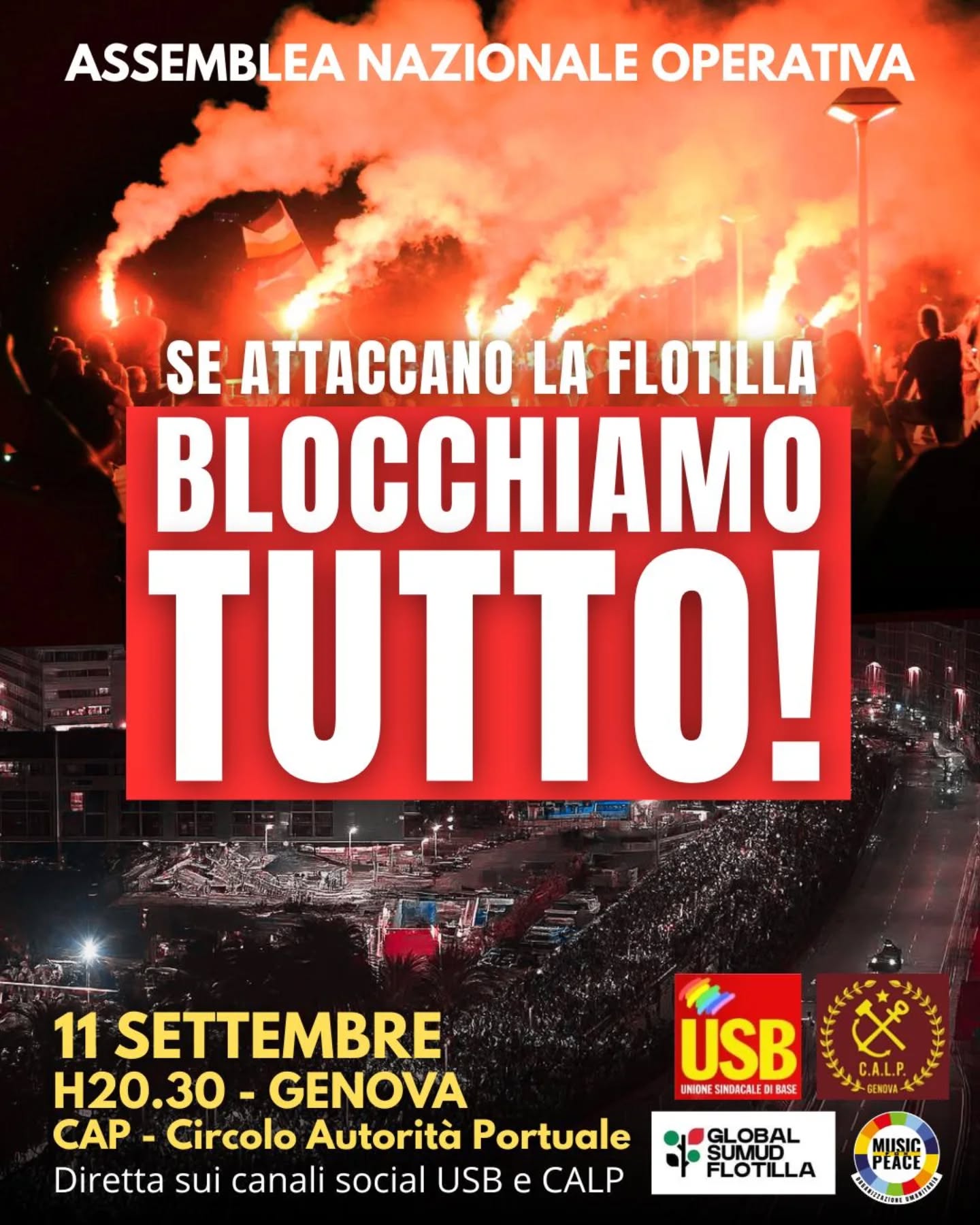 Il messaggio che è partito dai portuali di Genova sta attraversando il Paese e corre veloce per i porti di tutto il Mediterraneo. Sosteniamo la Global Sumud Flotilla, difendiamo i nostri fratelli e le nostre sorelle che sono su quelle barche, fermiamo il massacro.