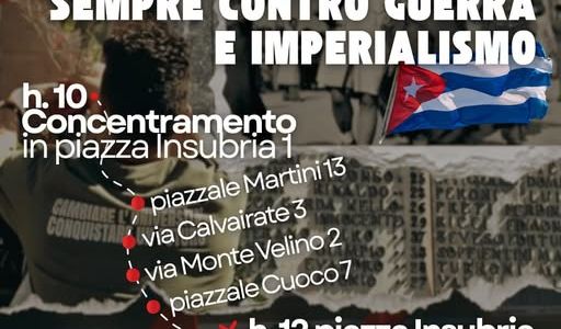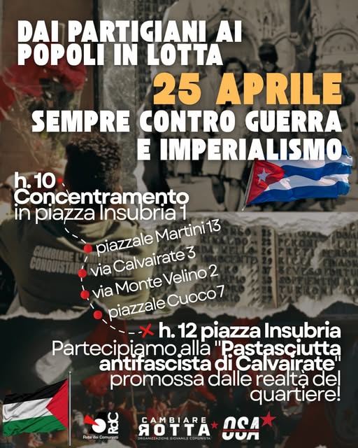 Sappiamo da che parte stare e chi sono i nostri esempi: ieri i partigiani che sconfissero il nazi-fascismo, oggi i popoli che resistono, da Cuba al Medio-Oriente: il 25 aprile appuntamento dalle 12 in piazza Insubria per un momento di socialità e condivisione all’insegna dei valori della Resistenza.