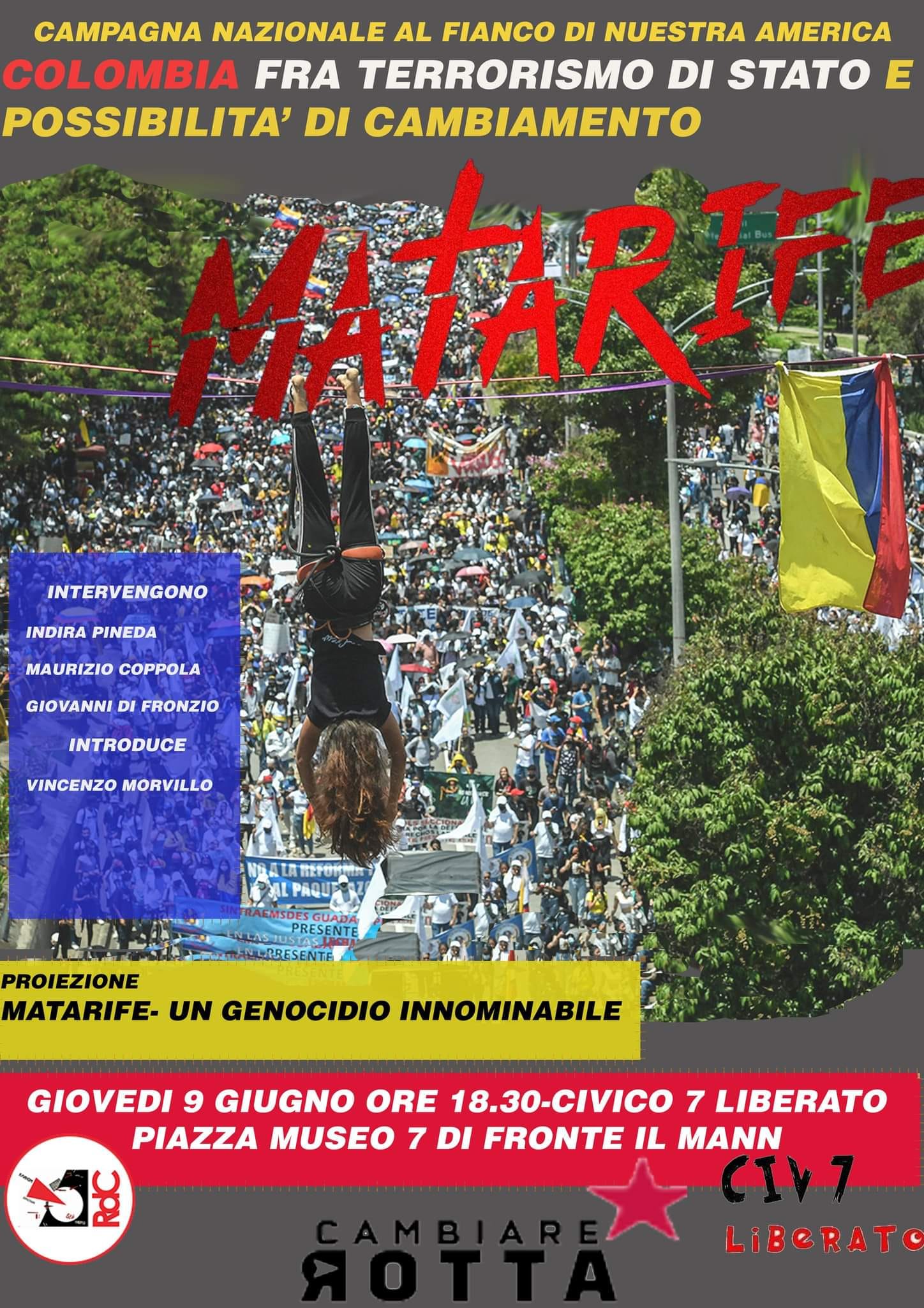 Giovedì 9 Giugno, alle ore 18:30, presso gli spazi del Civico 7 Liberato (Portici Galleria Principe di Napoli) presenteremo l’iniziativa “La Colombia tra terrorismo di Stato e possibilità di cambiamento”.