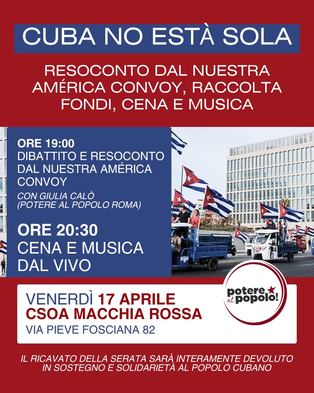 Il ricavato della serata sarà interamente devoluto in sostegno e solidarietà al popolo cubano. Rispondiamo al bloqueo con la solidarietà, al fianco di Cuba socialista. Partecipa anche tu alla raccolta di fondi, porta farmaci e materiali a sostegno del popolo cubano.