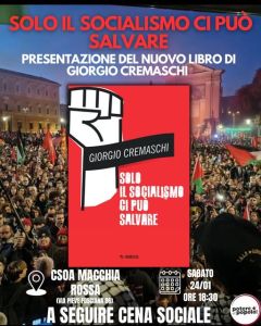 Sabato 24 gennaio alle ore 18:30 presso il Csoa Macchia Rossa (via Pieve Fosciana 89) presentazione de il nuovo libro di Giorgio Cremaschi “Solo il socialismo ci può salvare”. Sarà presente l’autore.