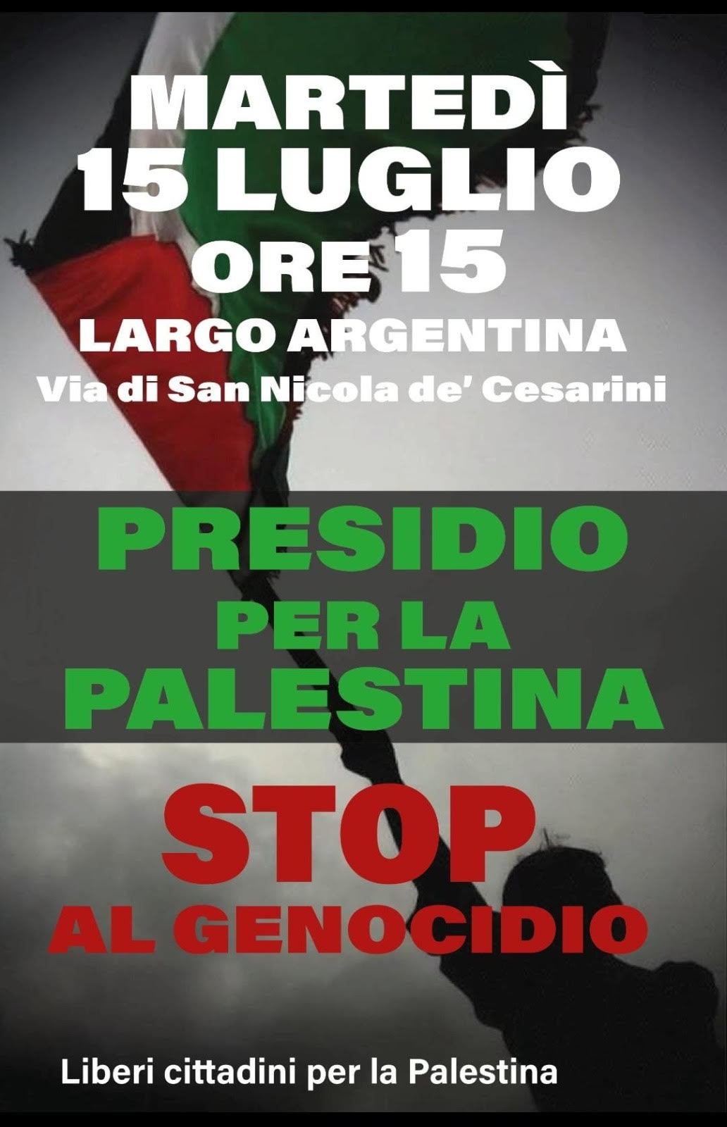 Martedì 15 luglio, h. 15:00-18:00Via San Nicola de’ Cesarini (Largo Argentina) Roma STOP AL GENOCIDIO IL COMUNE DI ROMA COSA FA? Il genocidio continua nella Striscia di Gaza, come continua la pulizia etnica in Cisgiordania e Gerusalemme Est. Mentre i palestinesi muoiono sotto le bombe, per ferite non curate, per fame e per sete il Comune di Roma per 21 mesi è rimasto silente. Per questo martedì scenderemo in presidio e chiederemo al Comune di Roma - di sospendere ogni collaborazione commerciale, culturale e sportiva con Israele (con particolare riferimento ai contratti con Teva e Mekorot); - di esprimere solidarietà a Francesca Albanese; - di conferire la cittadinanza onoraria al dottor Hassam Abu Safiya; - di esporre la bandiera palestinese.