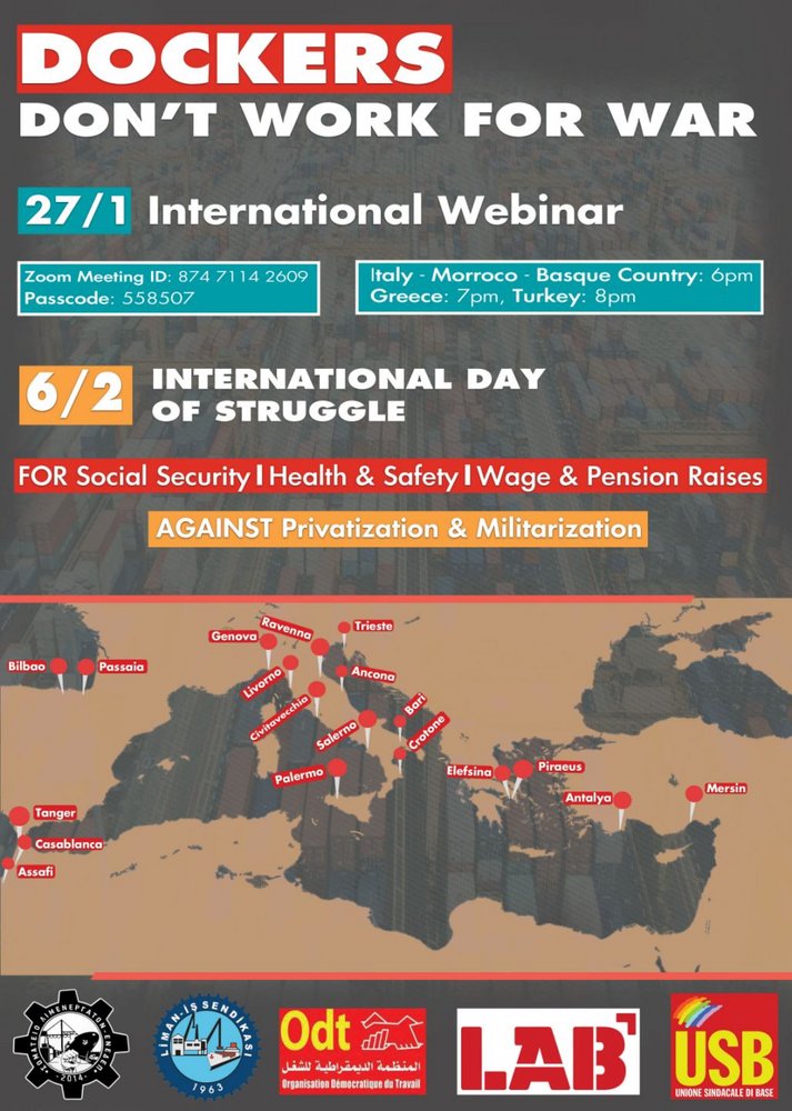 I sindacati Enedep di Grecia, Lab dei Paesi Baschi, Liman-Is di Turchia, ODT del Marocco e USB in Italia hanno organizzato un webinar internazionale, ore 18, per comunicare tutte le informazioni sulla Giornata internazionale di azione e lotta il 6 febbraio 2026.