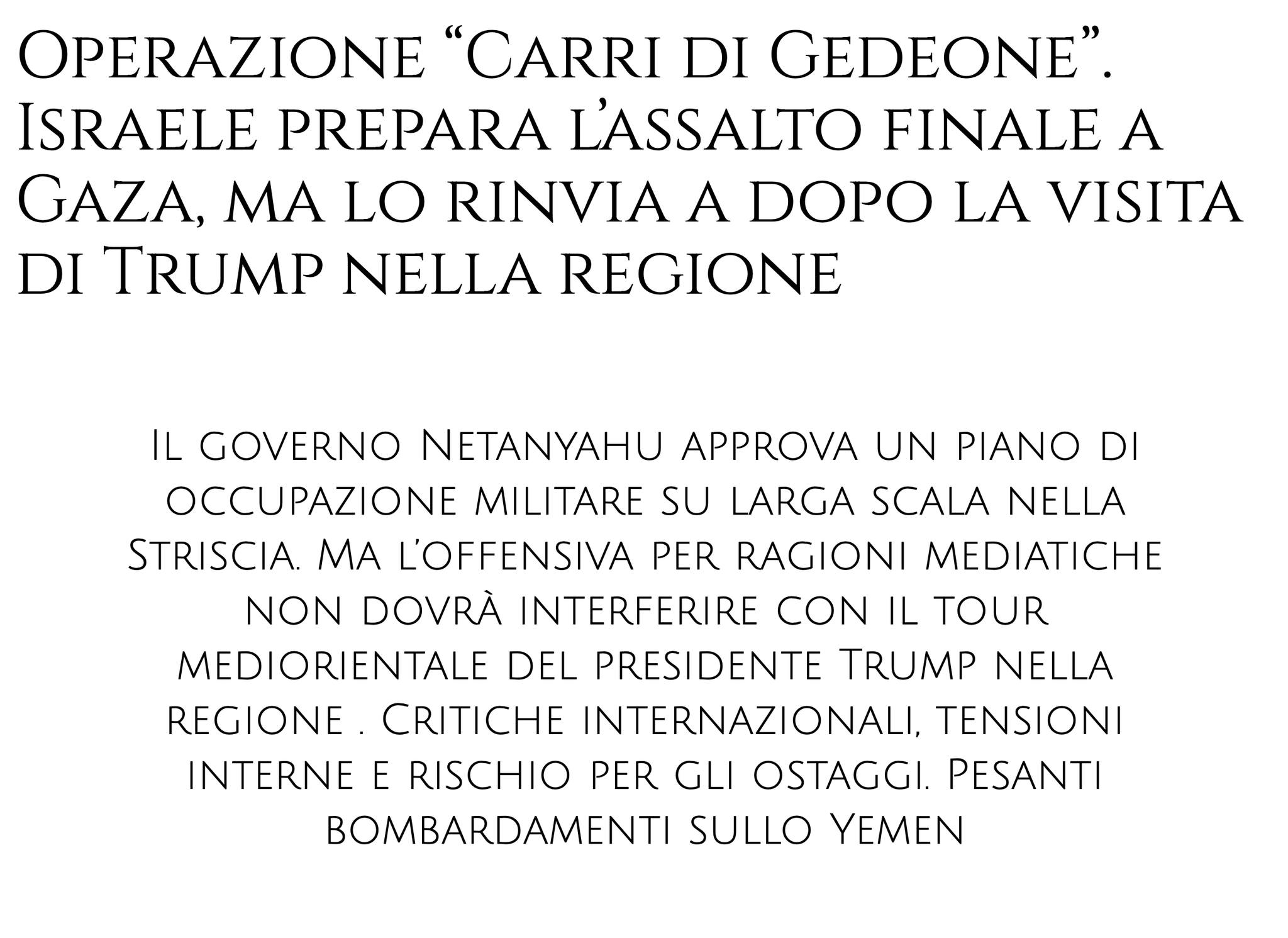 Mi sono guardato intorno, e ho visto i miei tecnici allestire lo spettacolo finale. È la cerimonia tribale da cui è impossibile sfuggire, con ruoli già assegnati: agli israeliti, i ruoli principali, insieme attori e personaggi; ai palestinesi, il ruolo di comparse da sacrificare; alle genti del mondo, quello di spettatori; a Trump e la sua corte, il ruolo di invitati speciali. La cerimonia del massacro avverrà in mondovisione.