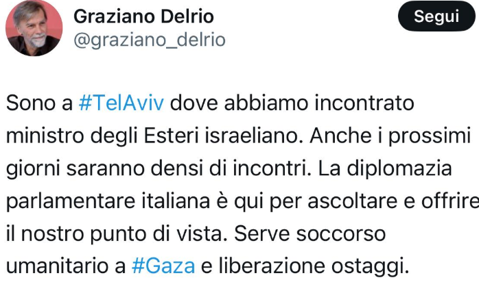 Ora il senatore piddino, tutto orgoglioso, ci fa sapere del suo viaggio a Tel Aviv e in un suo post vanta i “fruttuosi” incontri con il mascalzone israeliano e con altri suoi pari.