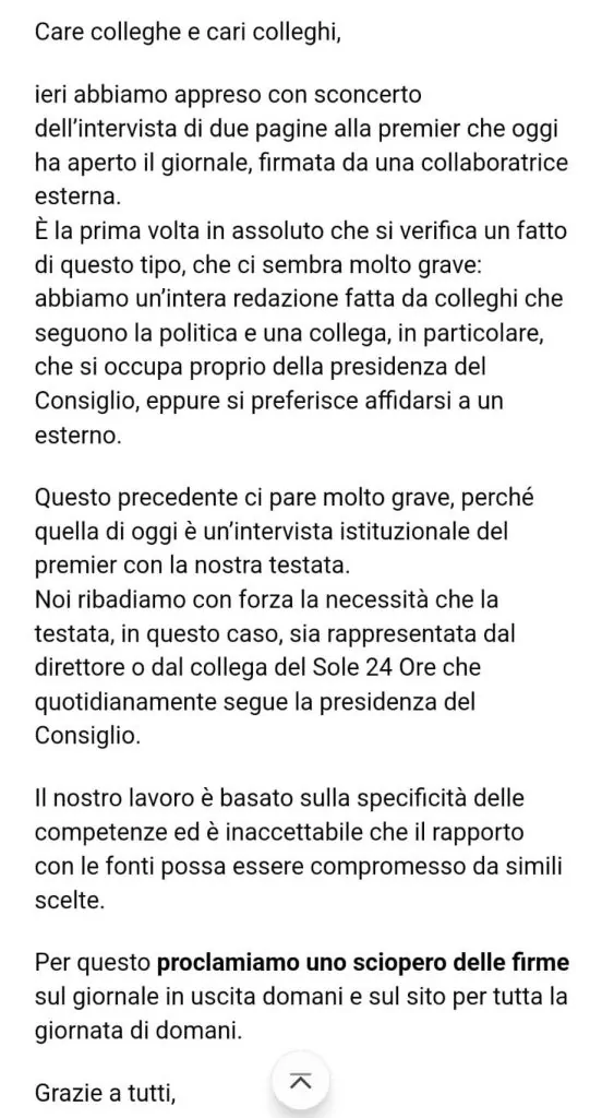 L’episodio è noto: la redazione del Sole 24 Ore proclama uno sciopero contro la decisione della direzione di pubblicare un’intervista a Giorgia Meloni affidata a una giornalista esterna, scelta al di fuori della redazione. Lo sciopero viene ignorato, il giornale esce comunque, e i redattori lo definiscono “indecoroso“. È una rottura senza precedenti nella storia della testata, segno della tensione crescente fra la stampa economica e il potere politico.