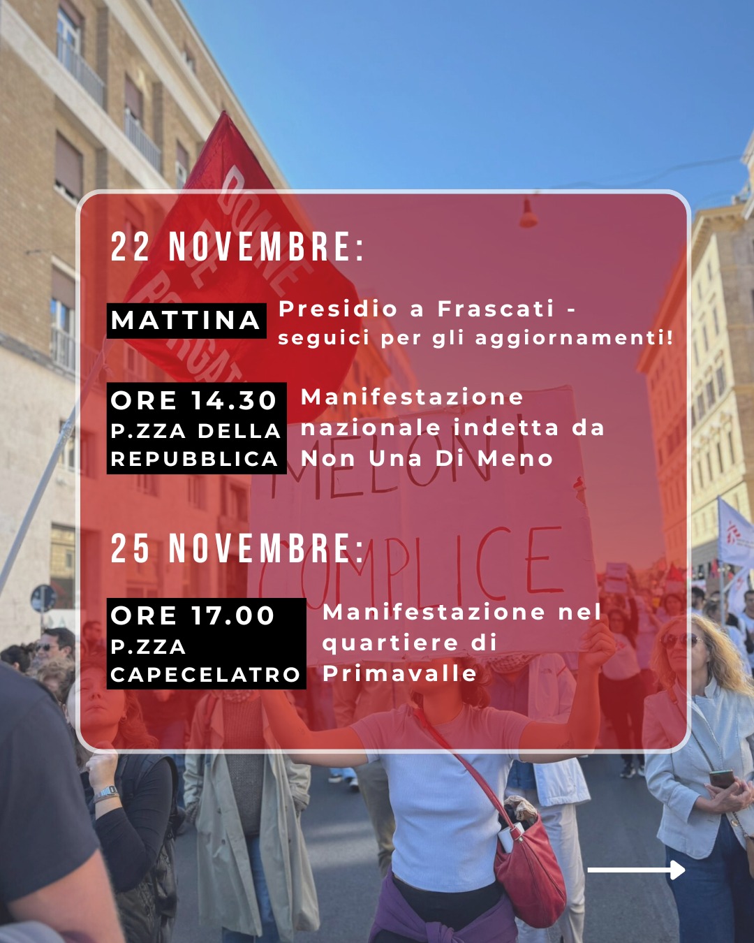 Ci vediamo la mattina di sabato 22 novembre a Frascati in via Cesare Battisti (appuntamento per cui seguiranno aggiornamenti), alle ore 14:30 a Piazza della Repubblica per la manifestazione nazionale indetta da Non Una di Meno Roma e martedì 25 novembre, giornata internazionale contro la violenza di genere, saremo alle ore 17 a Piazza Alfonso Capecelatro, nel quartiere di Primavalle, dove con varie tappe, rimetteremo al centro i bisogni delle donne di un quartiere fortemente colpito da femminicidi e dall’abbandono da parte delle istituzioni all’assenza di tutele e garanzie, e che, come primo passo per il proprio riscatto, vuole uno sportello anti-violenza.