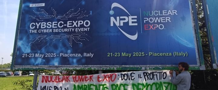 Presentandosi alla fiera piacentina con uno striscione con su scritto “Nuclear Power Expo: dove il profitto vale più di ambiente, pace e democrazia”, che rilanciava sulla manifestazione nazionale del 21 giugno, i militanti sono intervenuti condannando le aziende venute a “spartirsi il bottino del ritorno al nucleare” così come le forze politiche al governo e all’opposizione “che da destra a sinistra fanno a gara per spartirsi fette di mercato di una tecnologia ecocida e legata a doppio filo con la guerra”, lo ha ribadito uno degli attivisti intervenuto al megafono davanti allo spazio fiere.