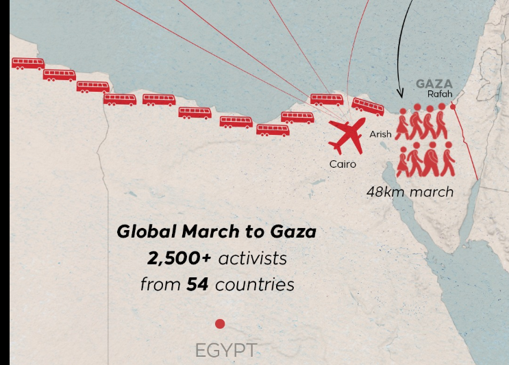 Il movimento si riunirà al Cairo il 12 giugno, per poi marciare a piedi per tre giorni da Al Arish verso il valico di Rafah, trasmettendo un messaggio globale di resistenza e speranza alle porte di Gaza.
