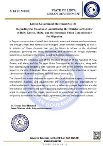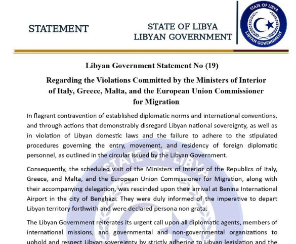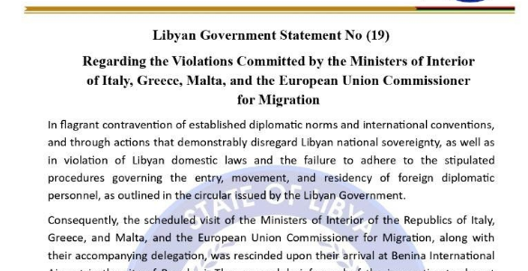 Il comunicato ufficiale porta la firma del capo del governo libico dell’est, Osama Hammad, definisce l’episodio un “chiaro superamento delle consuetudini diplomatiche e dei trattati internazionali”.