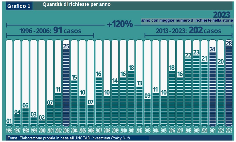 Le richieste di risarcimento tra gli investitori e Stati si sono moltiplicate negli ultimi due decenni: da un totale di 6 casi noti trattati nel 1996, siamo arrivati a 1332 casi noti entro la fine del 2023. 3 Di questo totale, i paesi dell’America Latina sono stati citati in giudizio 380 volte, il che rappresenta il 28,5% delle richieste di risarcimento da parte degli investitori a livello mondiale.