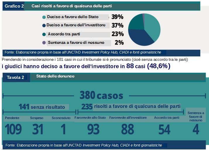 Nell’arbitrato sugli investimenti, gli Stati sono stati i grandi sconfitti. Delle 380 richieste di risarcimento note contro i paesi dell’America Latina e dei Caraibi, in 239 casi c’è stata una risoluzione del caso (tramite sentenza del tribunale o accordo tra le parti 8). Dei 239 casi risolti, l’investitore ne ha beneficiato in quasi il 60% dei casi 9.