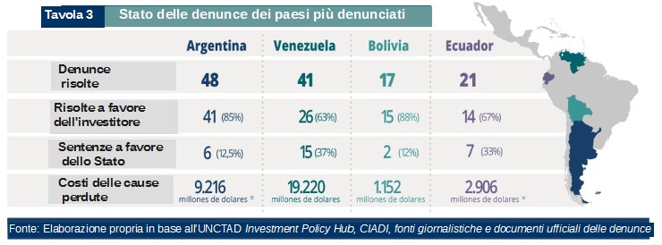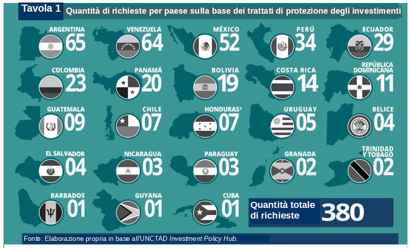 Argentina, Venezuela, Messico, Perù ed Ecuador sono i paesi più citati in giudizio. Complessivamente i cinque paesi hanno ricevuto 244 richieste di risarcimento, pari a quasi 2/3 del numero totale di richieste di risarcimento contro i paesi dell’ALC.