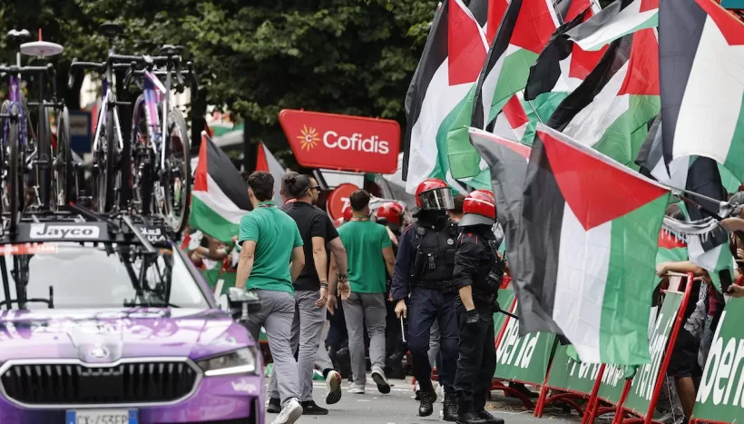Del resto i ciclisti, incluso i corridori della israeliana Israel Premier Tech, hanno attraversato l’Aragona senza intoppi. Ma appena arrivati a Euskal Herria si sono imbattuti in centinaia di manifestanti che, rispondendo all’appello dei gruppi territoriali BDS, della piattaforma Gernika-Palestina e di EH Bildu tra gli altri, hanno riempito i bordi delle strade della bandiera palestinese e dell’Ikurriña (la bandiera basca), costringendo la direzione della Vuelta a prendere una decisione straordinaria.