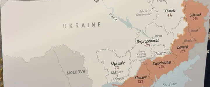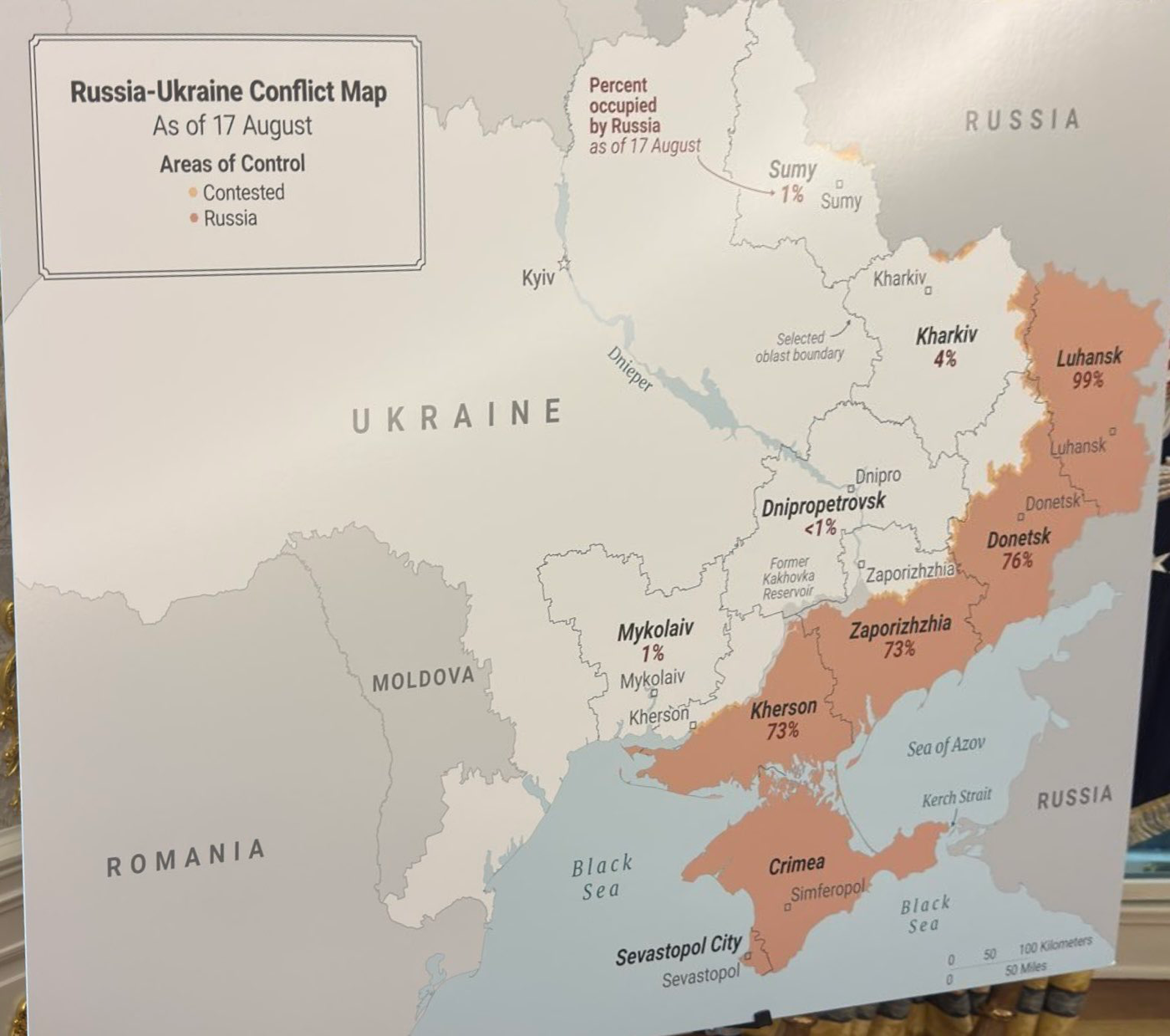 In quanto persona che ha iniziato la sua vita professionale nell’immobiliare nel Queens e a Manhattan, il Presidente Trump si è presentato all’incontro con Zelensky e i leader europei preparato a parlare di “scambi di territori” come parte di un potenziale “accordo di pace”. La sua mappa mostra in rosso, in modo prominente, la percentuale di ciascuna provincia attualmente controllata dalle truppe russe.