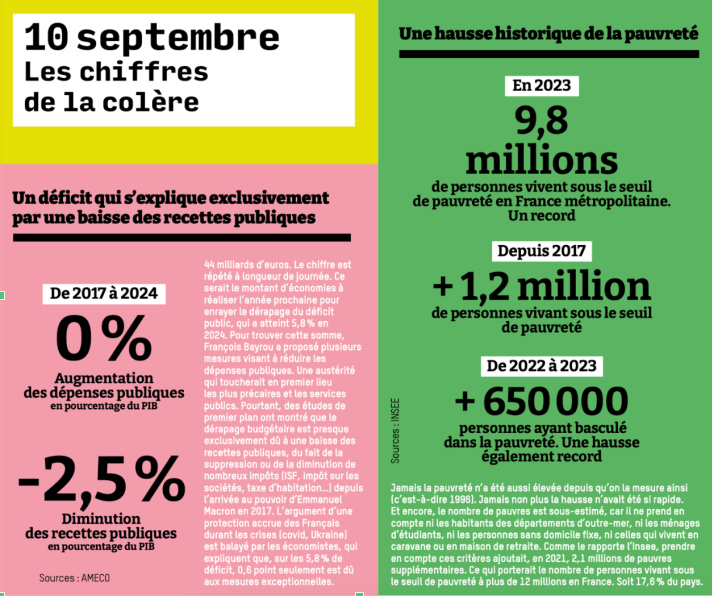 Un breve resoconto cronologico degli eventi: il 15 luglio il governo del repubblicano Bayrou ha proposto una legge di bilancio sui binari dell’austerità, con tagli sociali che si aggirano intorno ai 44 miliardi di euro: due giorni festivi cancellati, tagli massicci alla sanità, congelamento delle pensioni e la soppressione di migliaia di posti di lavoro nel settore pubblico.