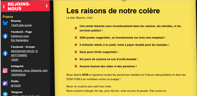 Nelle settimane successive, sui social networks, ha preso forma una rete dal basso che dietro le parole d’ordine “bloquons tout”, ha iniziato ad alimentare e “organizzare” il dissenso di fronte alla nuova proposta di budget, raccogliendo ampio consenso, che, sedimentandosi, ha coinvolto anche forze politiche di sinistra e sindacati.