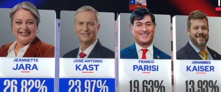 Una vittoria della candidata governativa Jannette Jara di stretta misura sul Repubblicano Kast (26,8 contro 23,9). Non ha raggiunto neanche il 30% che le davano i sondaggi pre-elettorali, che in ogni caso non le avrebbe dato la vittoria al primo turno. Ci sarà quindi il ballottaggio “la segunda vuelta” il 14 dicembre.