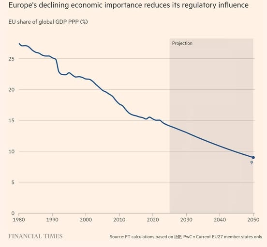 Il grafico qui di fianco mostra senza possibilità di dubbio cosa vada in realtà inteso per “declino europeo” – dunque anche occidentale, euro-atlantico nel suo insieme: non solo o non tanto un “impoverimento assoluto” (che pure c’è stato soprattutto per le classi popolari), quanto una perdita di “peso specifico” in relazione agli altri soggetti, storici o emergenti.