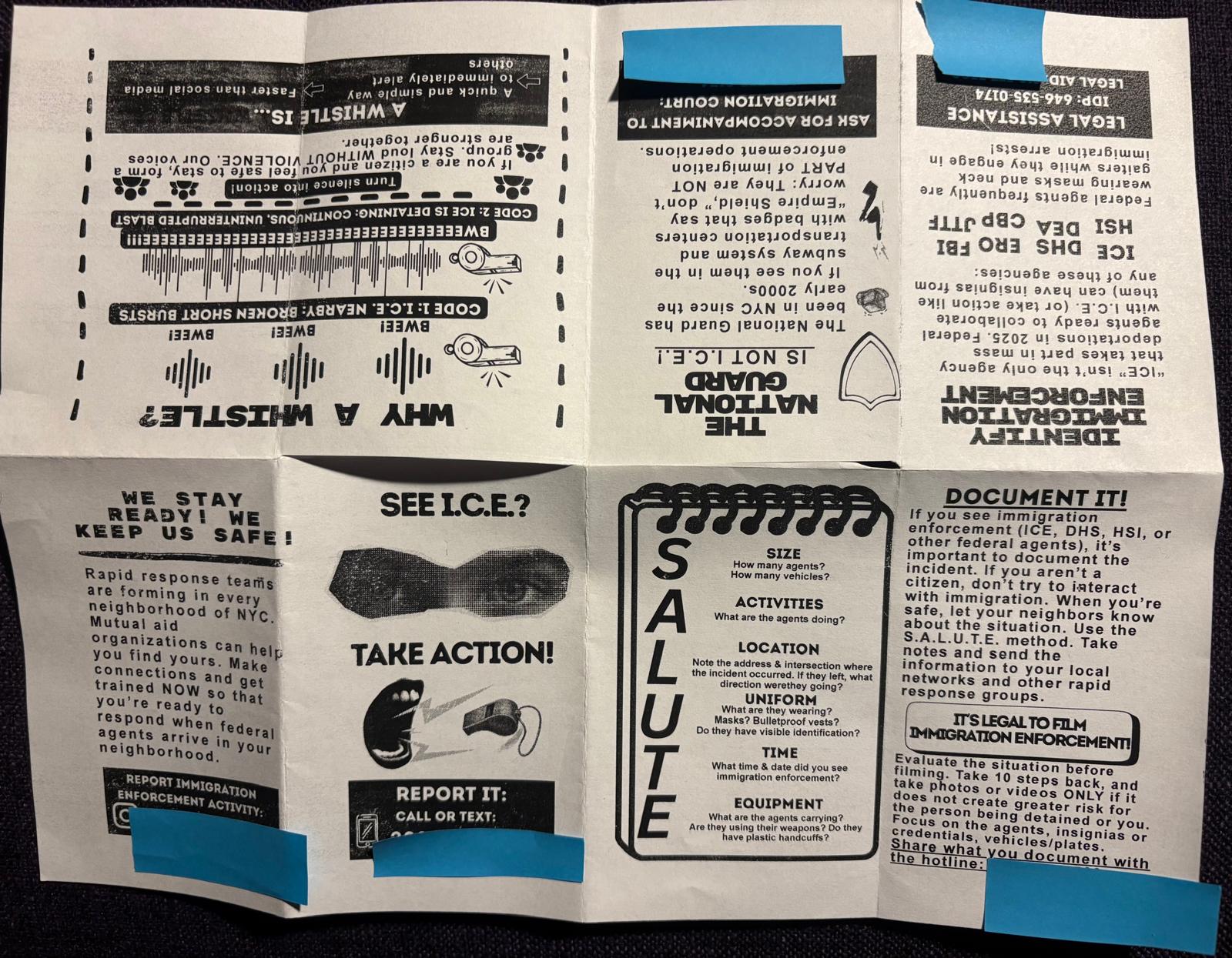 La sezione dedicata al fischietto è commovente e meriterebbe un posto al museo dadaista (se esistesse). Illustra due codici. Codice Numero 1: bwee! bwee! bwee! Soffiare a ripetizione significa: l’ICE è stato avvistato in zona, state allerta. Codice Numero 2: bweeeeeeeeeeeeeeeeeeee !!! Emettere un suono forte e continuativo significa l’ICE sta effettuando un arresto – massima allerta e pronti ad attivare il servizio legale, di cui ovviamente il manuale fornisce il numero.