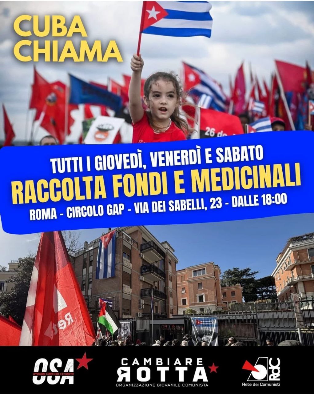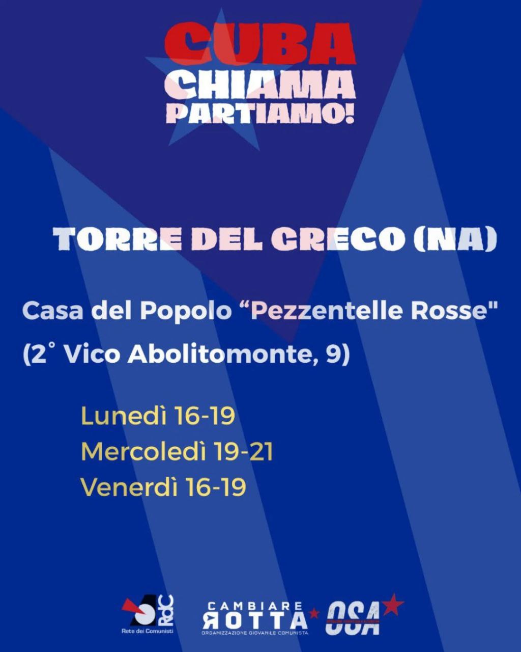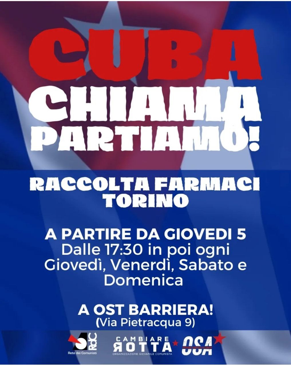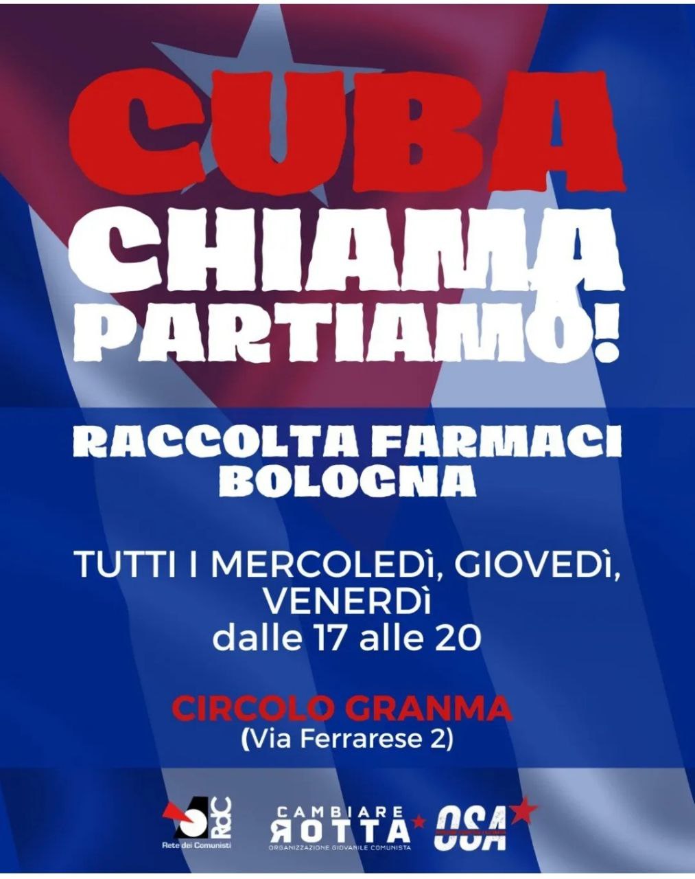 In seguito al lancio della campagna di solidarietà internazionalista con Cuba, strozzata dall’assedio statunitense, la Rete dei Comunisti, Cambiare Rotta e OSA hanno organizzato vari presidi fissi, oltre a diverse iniziative, per raccogliere medicinali e fondi, dal nord al sud del paese. L’obiettivo è quello di inviare un sostegno concreto alla resistenza antimperialista dell’isola.
