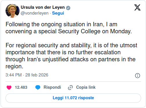 In questo modo però non c’è soluzione di alcun tipo. Tra l’altro, Ursula von der Leyen, come presidente della Commissione Europea, alcune ore dopo i primi attacchi in Iran nel corso del weekend, ha scritto un messaggio su X per informare che sarebbe stata indetta una riunione straordinaria dei vertici Ue, ma solo il lunedì mattina, suscitando moltissime perplessità e commenti sul web. Come se non si trattasse di una crisi internazionale, ma di un lavoro impiegatizio d’ufficio che si può rimandare al lunedì mattina. In quest’ottica, cosa pensa della classe politica europea? Sono preparati a questo nuovo scenario?