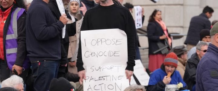 Sabato, i manifestanti si sono seduti a terra o su sedie da campeggio con dei manifesti in mano. Alcuni indossavano kufija bianche e nere e sventolavano bandiere palestinesi. Tenevano cartelli e striscioni che sottolineavano il diritto alla libertà di espressione ed esprimevano la loro opposizione al coinvolgimento britannico nelle guerre imperialiste in Medio Oriente. Molti indossavano magliette con l’iscrizione “Rifiuto il genocidio. Sostengo Palestine Action.” La polizia ha colto questa occasione per portare gradualmente via i manifestanti dalla piazza e arrestarli per aver sostenuto il terrorismo.