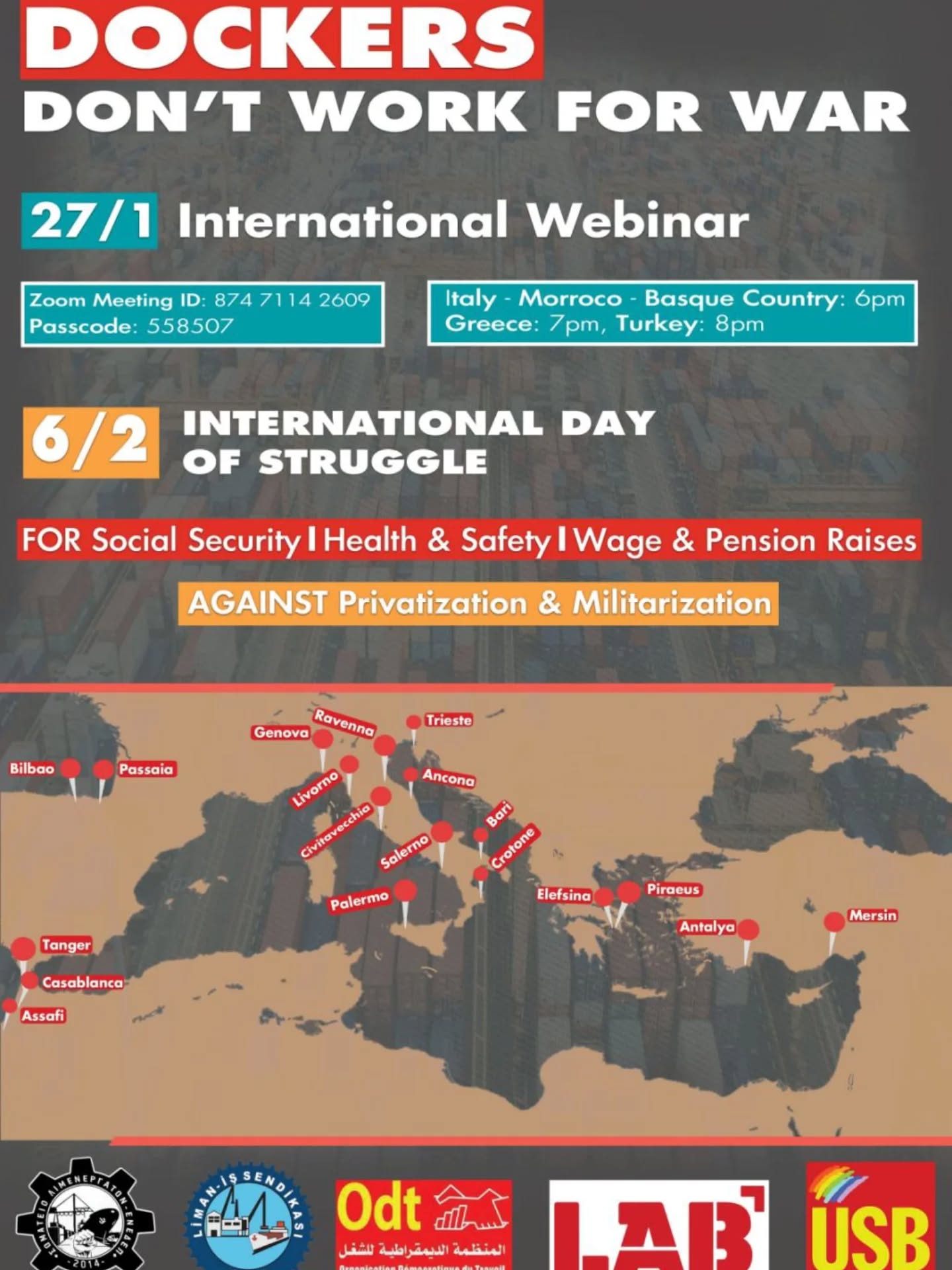 Lo sciopero internazionale verrà presentato con un webinair il prossimo 27 gennaio alle 18 ora Italiana, dove oltre USB parteciperanno le altre organizzazioni promotrici (vedi locandina allegata). Alla giornata aderiranno alcuni dei principali scali del Mediterraneo come il Pireo, Bilbao, Elefsina Tangeri , Mersin e Antalya; in Italia ad oggi hanno dato adesione i porti di Genova, Trieste, Livorno, Ancona, Civitavecchia, Ravenna, Salerno, Bari, Crotone e Palermo, ma le adesioni sono in aggiornamento e ci aspettiamo crescano nei prossimi giorni