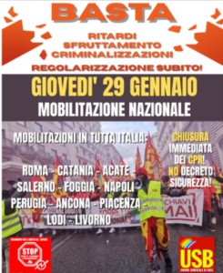 Il 29 gennaio in più di 10 piazze in Italia i lavoratori stranieri manifesteranno per richiedere il rispetto dei diritti di tutti. Insieme a USB saranno in piazza nelle varie città decine di associazioni, organizzazioni e forze sociali e politiche: presidi sono previsti a Roma, Catania, Acate, Salerno, Foggia, Napoli, Perugia, Ancona, Piacenza, Lodi e Livorno.