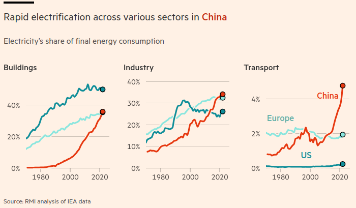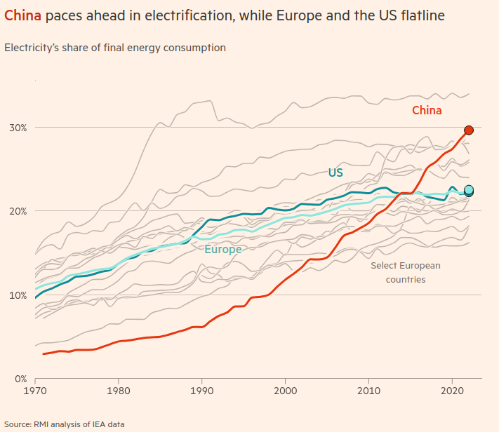Da allora, in quelle economie concorrenti, la quota di elettricità come fonte finale di energia si è stabilizzata intorno al 22%, mentre in Cina è balzata al 30%.