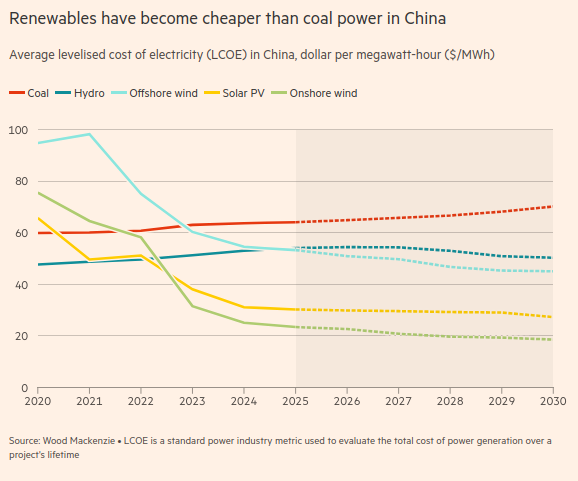Sostenuta da questi investimenti statali a lungo termine nella rete elettrica, la Cina è sulla buona strada per ottenere il 50% della propria energia da fonti a basse emissioni di carbonio – idroelettrico, solare, eolico, nucleare e sistemi di accumulo – entro il 2028. Circa dieci anni dopo, la capacità combinata di solare ed eolico dovrebbe superare, per la prima volta, quella della produzione elettrica a carbone.