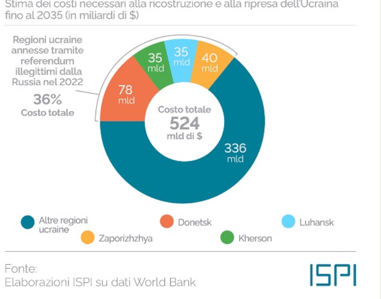 L’Ispi rileva che sebbene “l’intero territorio ucraino abbia subito attacchi a seguito del 24 febbraio 2022, il 66% dei danni diretti ($116 miliardi) e il 47% dei costi di ripresa/ricostruzione ($248 miliardi) totali sono da ascrivere alle sole regioni caratterizzate dai maggiori scontri – quelle di Kharkiv, Donetsk, Luhansk, Zaporizhzhya e Kherson”.