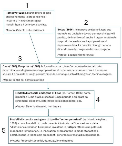 4. Modelli di crescita endogena di tipo I (es. Romer, 1986): come il modello 3, ma ora la crescita di lungo periodo è spiegata da rendimenti crescenti, esternalità della conoscenza, ecc.