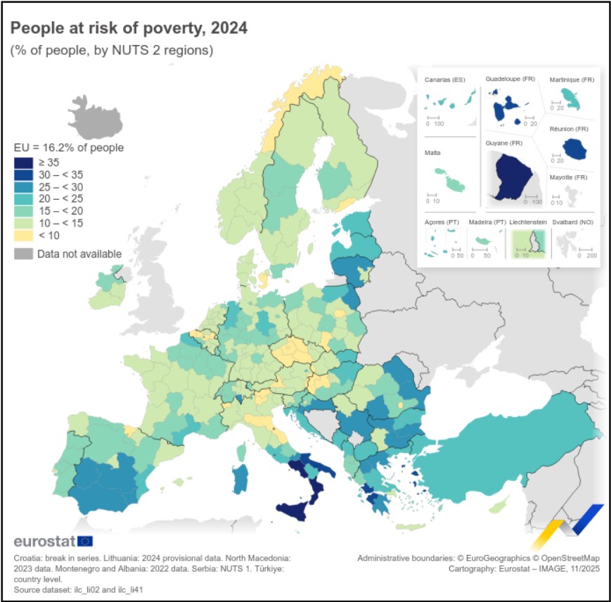 Si tratta di una dinamica al limite del colonialismo, della colonizzazione interna, e a volte anche oltre questo limite. Perché, difatti, sul podio delle tre regioni di paesi europei la cui popolazione è maggiormente a rischio di povertà troviamo la Guyana francese, (53,3%), Ciudad de Melilla (41,4%), e poi la Calabria (37,2%). E subito dopo, ci sono anche la Campania (35,5%) e la Sicilia (35,3%).