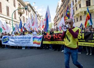In una netta predominanza di bandiere M5S, tante anche quelle arcobaleno per la pace, nel corteo hanno sfilato i vari spezzoni del movimento. Uno di questi canta Bella Ciao e grida slogan come “fuori i fascisti dallo Stato”.