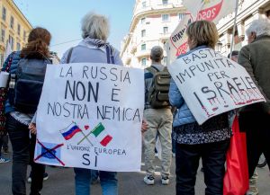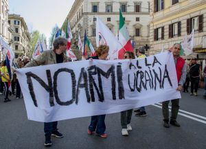 Sfilano anche le realtà esterne al M5S che hanno scelto di essere in piazza. Il Fronte del Dissenso con uno striscione che invoca “Pace con la Russia, viva la resistenza palestinese”. E poi lo spezzone di Rifondazione Comunista con una grande bandiera della pace e lo striscione “Fuori la guerra dalla storia”. Il Prc questa volta ha fatto uno sforzo con uno spezzone dignitoso, assai più più striminzito quello dei Giovani Comunisti.