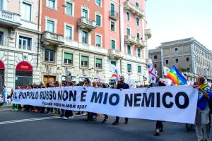 Più indietro ancora sfila c’è lo striscione bilingue “Il popolo russo non è mio nemico.