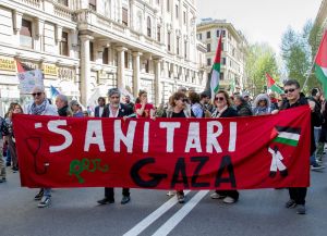 Sfila poi un bandierone della Palestina a compensare la scarsità di bandiere palestinesi nel corteo, sopperita però da molti slogan come Free Palestine in molti spezzoni anche del M5S. Pochissime – e per fortuna – le bandiere europee anche se una ha continuato a sventolare fastidiosamente davanti all’ex presidente della Camera Roberto Fico mentre interveniva dal palco.