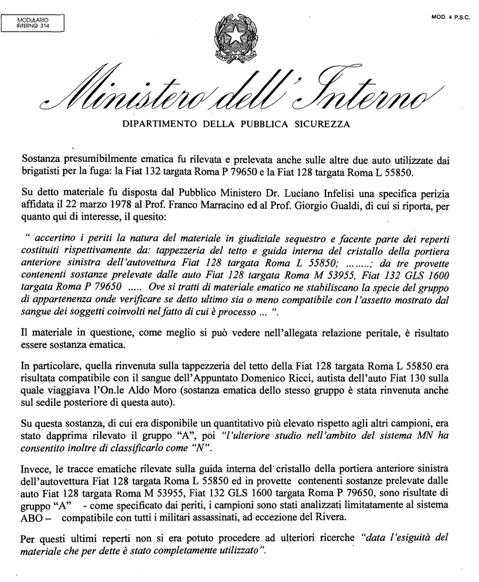 Il sangue rinvenuto sulla tappezzeria del tetto e sul sedile posteriore della Fiat 128 blu, targata Roma L55850, alla cui guida era salito Valerio Morucci che si era introdotto dopo la sparatoria nella Fiat 130 di Moro per raccogliere alcune borse, risultò compatibile con quello dell’appuntato Domenico Ricci, autista del mezzo sulla quale viaggiava Moro.
