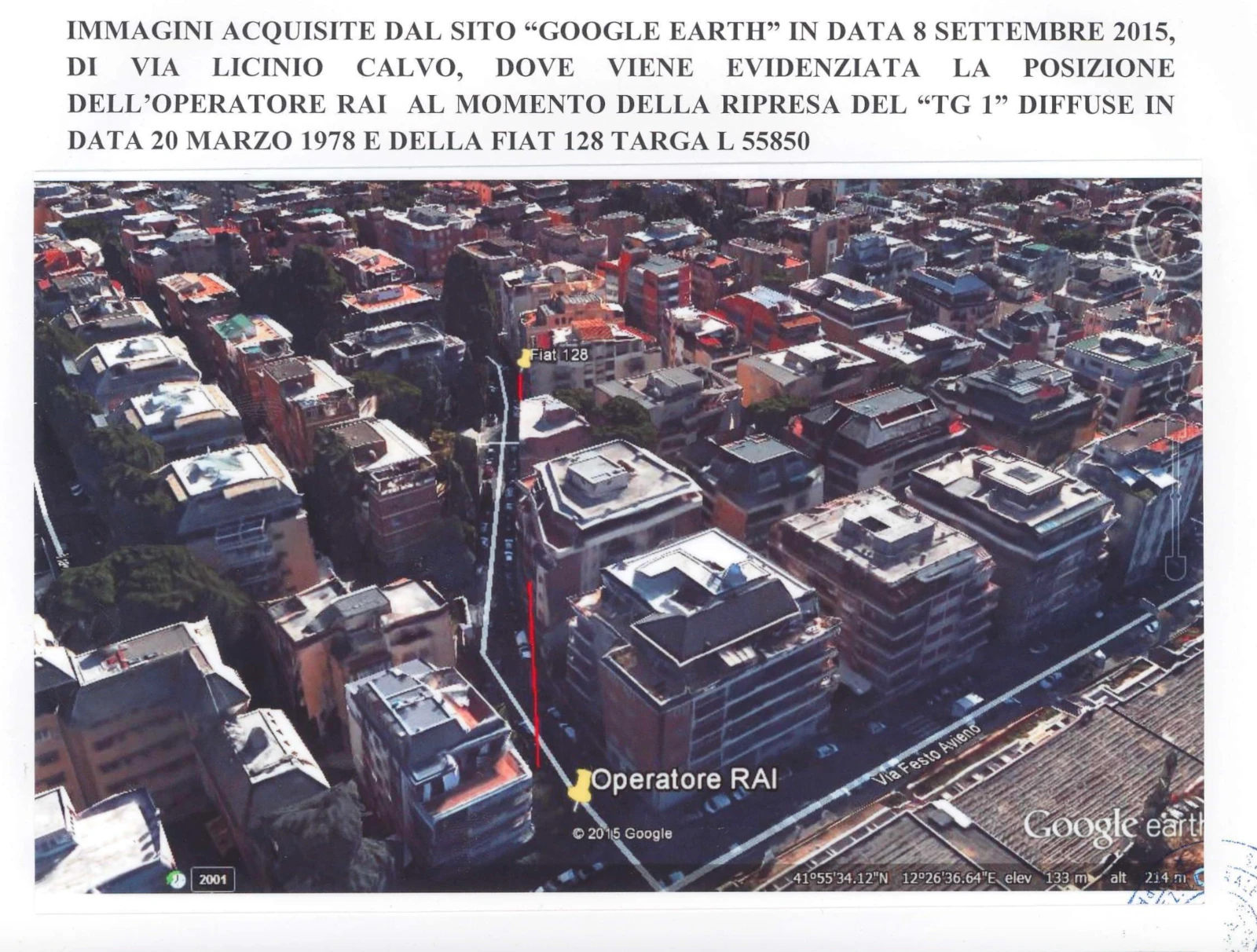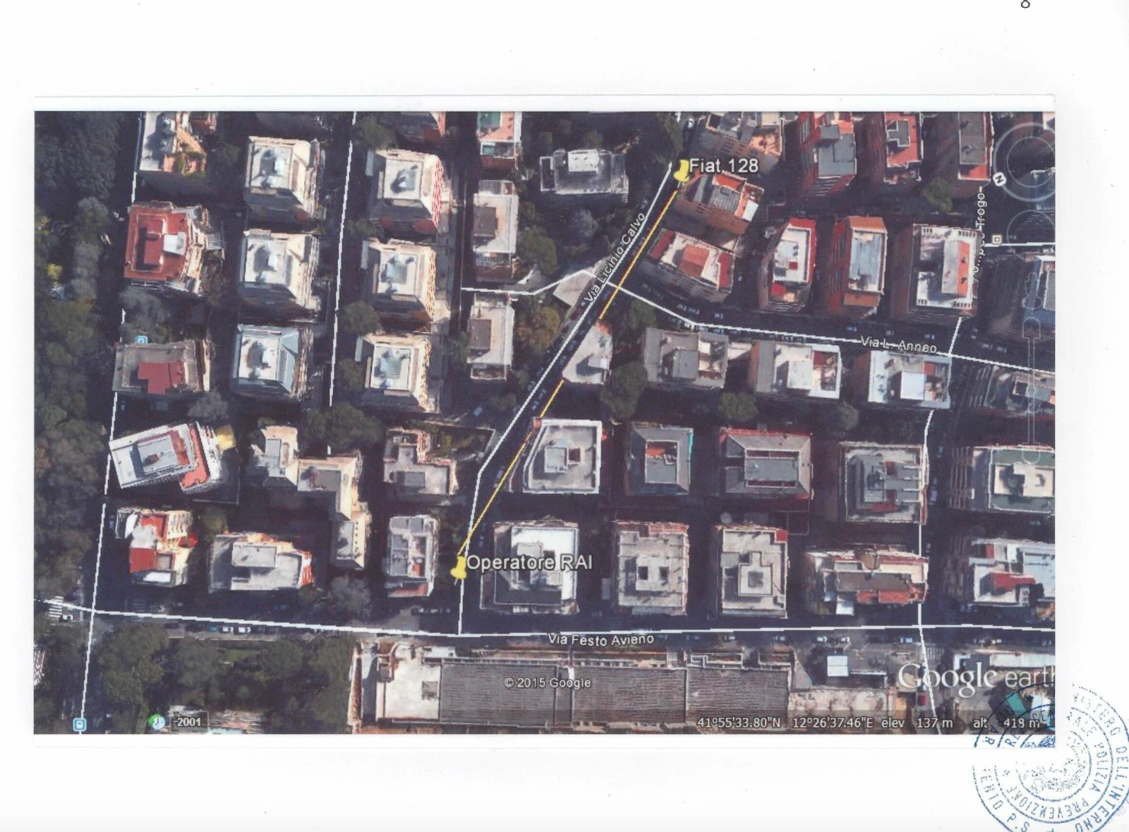 Secondo il rapporto, il mezzo era parcheggiato sulla parte alta di via Licinio Calvo, a pochi metri dall’incrocio con via Lucilio con l’avantreno rivolto verso via Festo Avieno. Nel rapporto non ci sono immagini allegate. Ad oggi, nonostante le migliaia di documenti consultati, non siamo mai incappati nelle foto del ritrovamento della Fiat 132. Si tratta sicuramente di una anomalia che speriamo venga colmata nel tempo o comunque trovi una risposta soddisfacente.