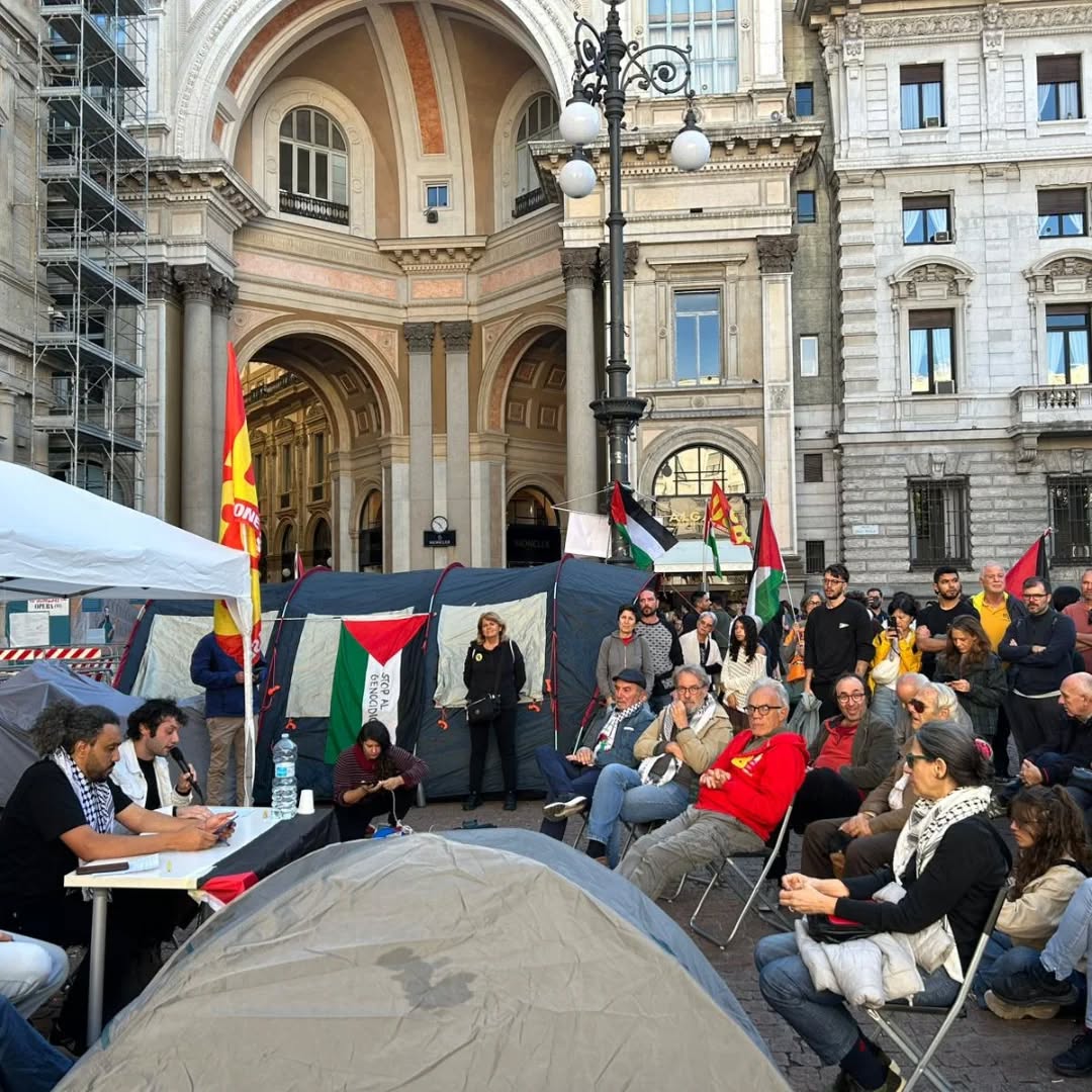 A Milano L’accampata è iniziata la sera di venerdi 26 sotto al Comune in Piazza Scala, rinominata Piazza Gaza, al termine di una giornata di mobilitazione all’aeroporto di Malpensa e poi di Linate. Sabato 27 l’accampata si è trovata al centro del palcoscenico della Milano Fashion Week che al teatro La Scala celebrava la serata dedicata alla moda etica e sostenibile. Visto il rifiuto da parte degli organizzatori di permettere un intervento dal palco si è svolta una contestazione all’esterno che ha trovato solidarietà tra le tante persone presenti, mentre l’ipocrita Sala dal palco del teatro terminava il suo intervento con lo slogan “free gaza”, dimenticandosi del gemellaggio esistente Milano-Tel Aviv.