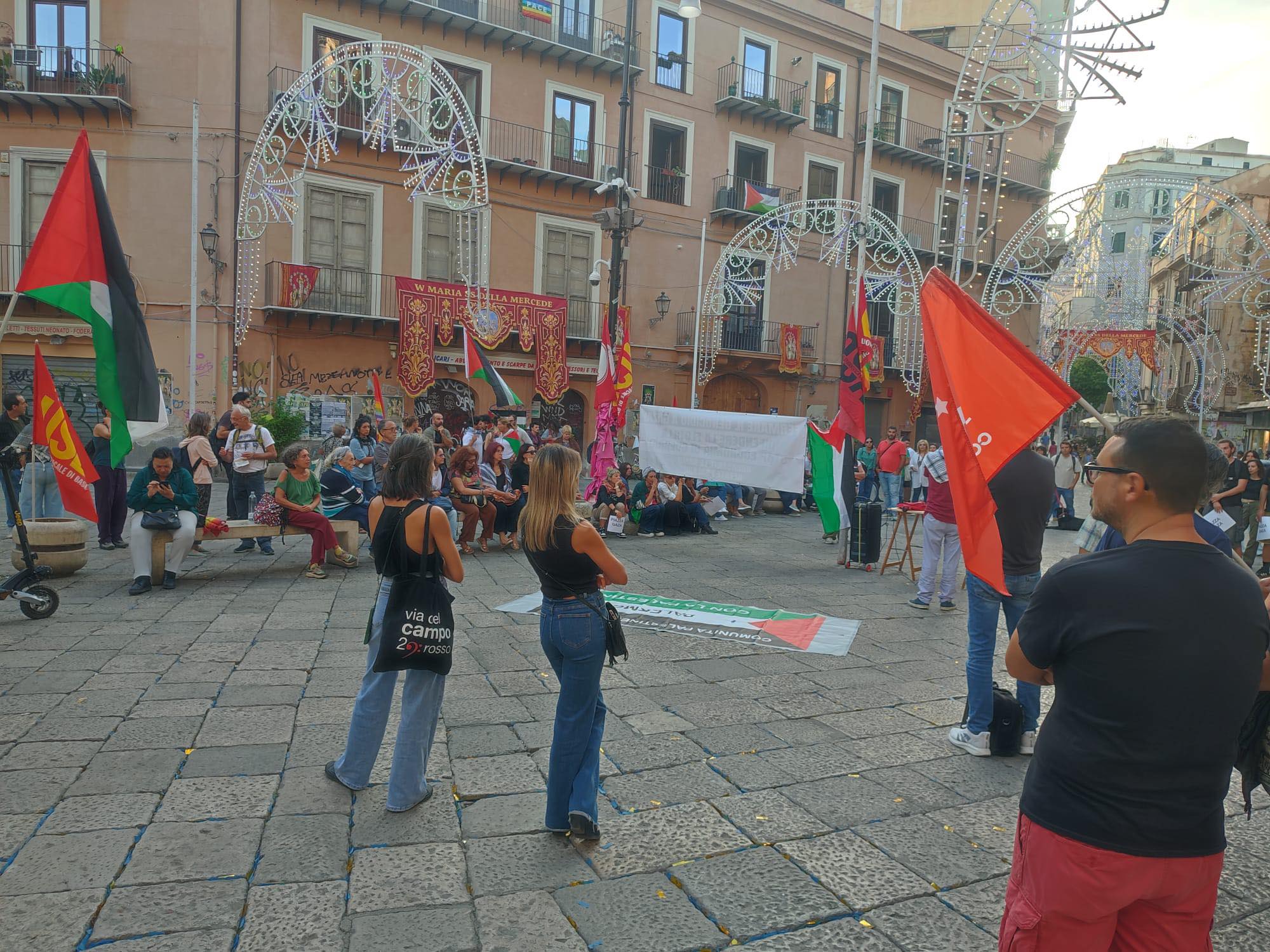 Qui da venerdì scorso è stato montato un gazebo con banchetto informativo e cassa di resistenza, in attesa di capire cosa succederà agli equipaggi della Sumud Flotilla una volta entrati nelle acque di fronte a Gaza e che il terrorista stato sionista continua a chiamare “acque israeliane”.
