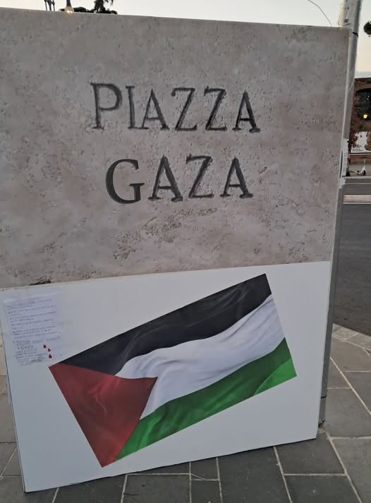 Intanto in piazza del Gesù da giorni si alternano militanti, attivisti, delegati sindacali ai banchetti. Tante le interazioni con le persone che transitano, chi chiede, chi saluta e ringrazia, chi mette soldi nella cassetta di raccolta fondi, chi prende un volantino e chi semplicemente si ferma a chiacchierare come in una qualsiasi piazza. Che intanto è stata ribattezzata Piazza Gaza, con tanto di cartello toponomastico fatto stampare dagli attivisti.